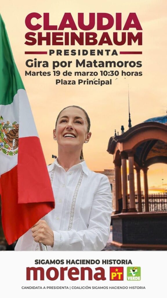 La coordinación de la campaña en Tamaulipas de Clauida Sheinbaum a cargo de Marco Batarse Ferrel le da la bienvenida a la candidata a la presidencia de la República de la aliaza de MORENA; Partido Verde y PT. Esta será la intensa gira de trabajo por el norte del País.